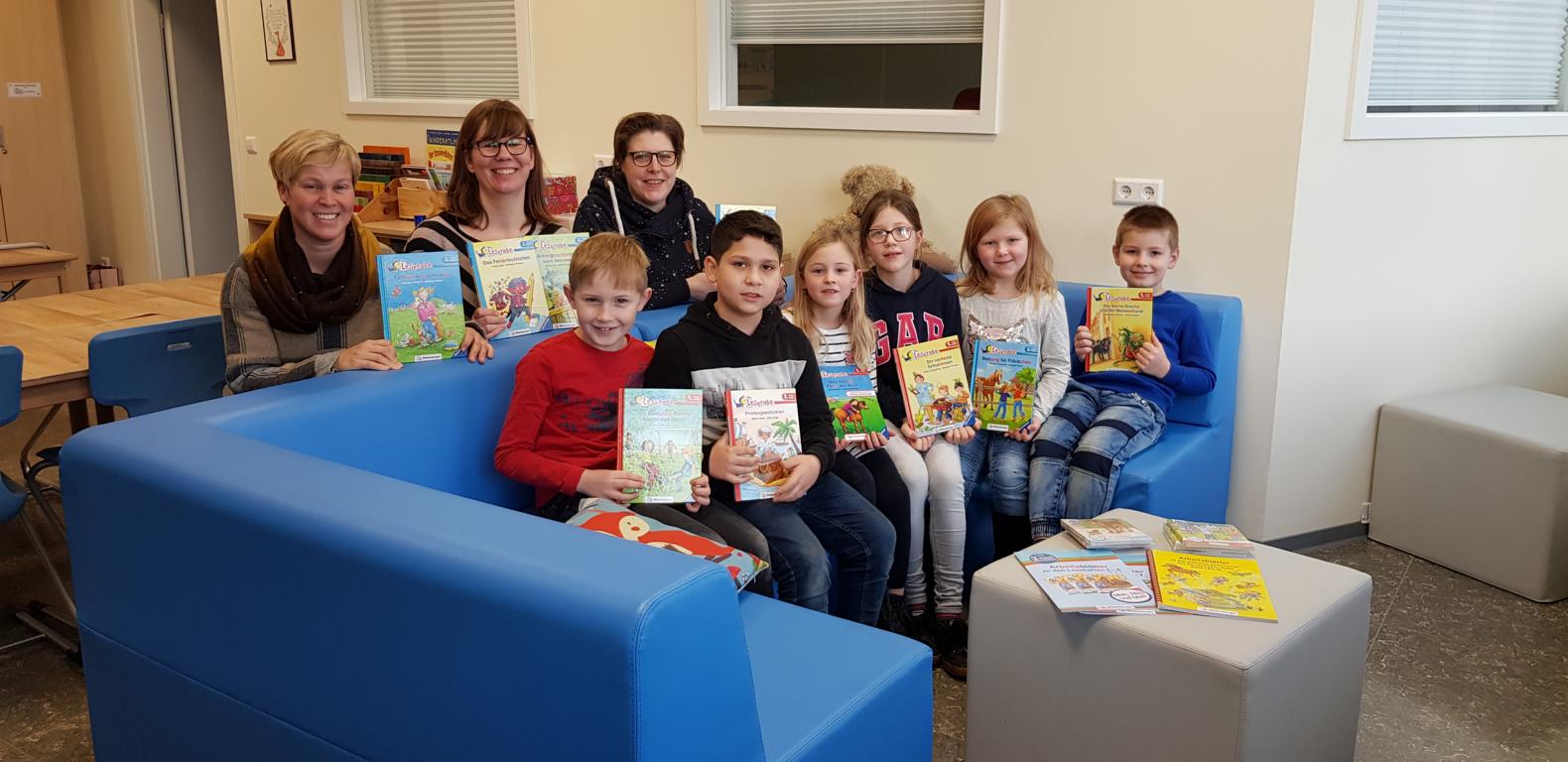 Passend zu Weihnachten überreichte Vera Königschulte vom Förderverein Hopsten Spiele für die Klassen 2 a und 2 b sowie viele neue Bücher für den Förderraum "Fuchsbau".