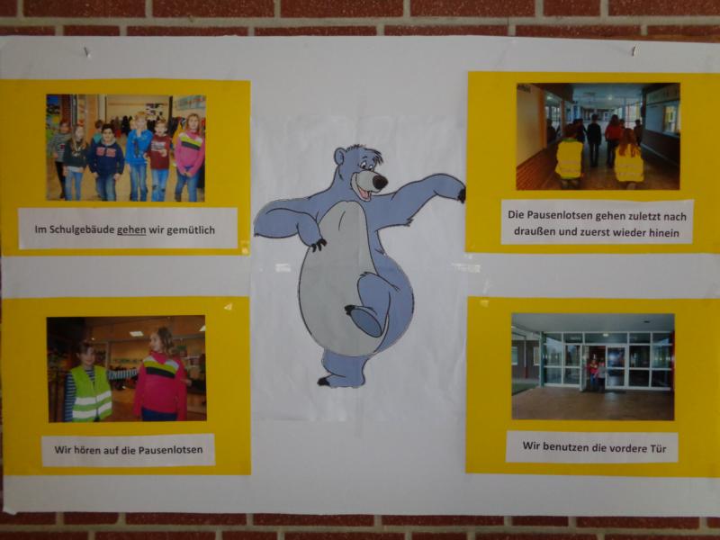 Der Gang in die Pause ist für viele Schülerinnen und Schüler eine besondere Herausforderung. Die langen Flure laden zum Rennen ein und immer wieder kommt es zu gefährlichen Situationen. Aus diesem Grund wurde die Aktion „Gemütlich mit Balu“ ins Leben gerufen. Zu Beginn und zum Ende jeder Pause ertönt in der gesamten Schule das Balu-Lied, das die Kinder daran erinnert, gemütlich wie ein Bär über den Flur zu schlendern. Gleichzeitig stehen an den Treppenauf- und abgängen Schülerlotsen, die darauf hinweisen, langsam zu gehen und insbesondere die Situation auf der Treppe im Blick haben. Außerdem kontrollieren die Pausenlotsen, ob alle Schülerinnen und Schüler die Klassenräume und Flure verlassen haben und sich keiner unberechtigt während der Pause im Schulgebäude aufhält. Außerdem stärken wir so die Mitbestimmung und die Mitverantwortung unserer Schülerschaft.